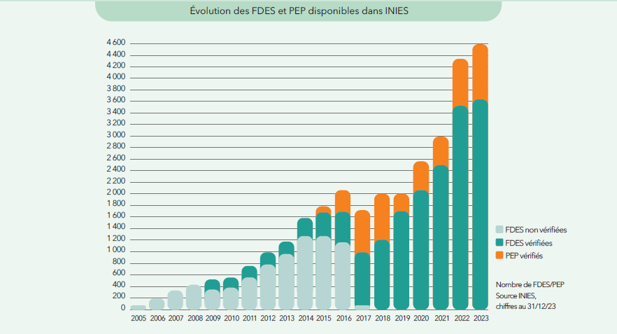 Fin 2022, la base INIES comptait 4 347 déclarations environnementales (3 536 FDES et 811
