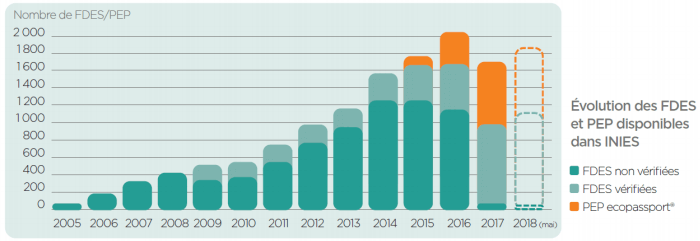 Environnementale et Sanitaire (FDES) pour les produits de construction, des Profils Environnementaux Produits (PEP) pour les équipements électriques, électroniques et génie climatique et des données conventionnelles de service (eau, énergie…). Ces informations sont le fruit d’une démarche volontaire des déclarants – fabricants, syndicats professionnels ou centres techniques – sur la base d’une Analyse de Cycle de Vie conforme aux exigences réglementaires françaises.