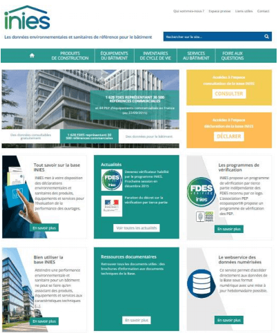 Au-delà d’un accès simple et gratuit aux FDES (Fiche de Déclaration Environnementale et Sanitaire) et aux PEP (Profil Environnement Produit) via deux entrées directes vers la base de données INIES (consultation, déclaration), le site s’enrichit de nouveaux volets dédiés à l’information. Ainsi, l’internaute peut chercher des renseignements par type de données en barre de navigation (produits de construction, équipements du bâtiment, inventaires de cycle de vie…) et à travers six pavés thématiques (actualités, ressources documentaires, programme de vérification…).