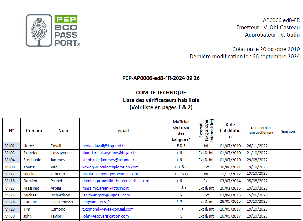 L’habilitation des vérificateurs s’appuie sur les exigences de la norme ISO 14025 et tient compte des meilleures pratiques professionnelles. Cette procédure vise à qualifier et sanctionner les compétences requises pour assurer la qualité et l’indépendance des vérifications des PEP soumis au processus de conformité du Programme PEP Ecopassport.