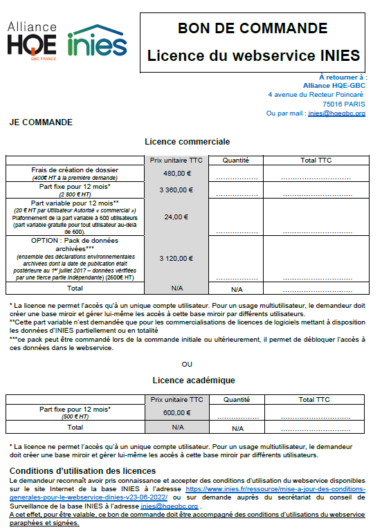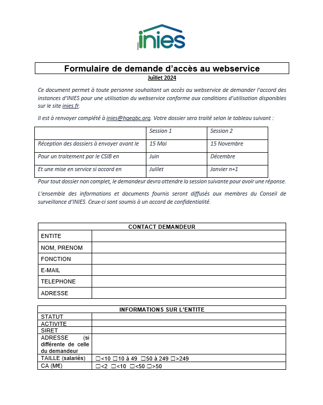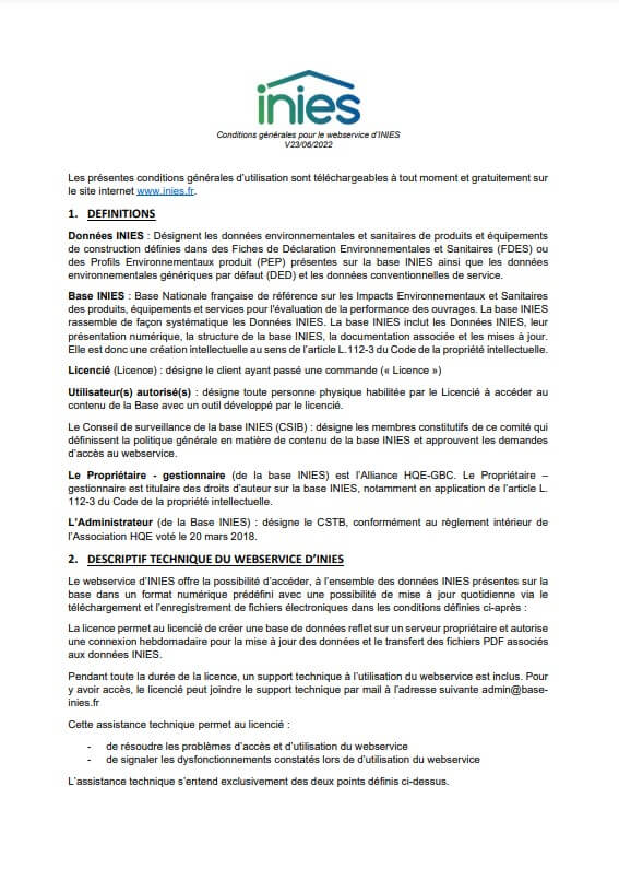 Un formulaire est mis à disposition sur le site afin de permettre à toute personne souhaitant un accès au webservice de demander l’accord des instances d’INIES. Cette demande devra, pour être validé, respecter les conditions d’utilisation du webservice.