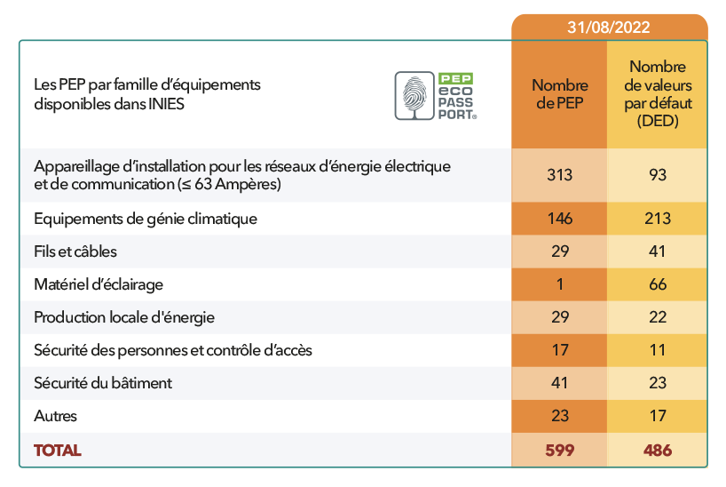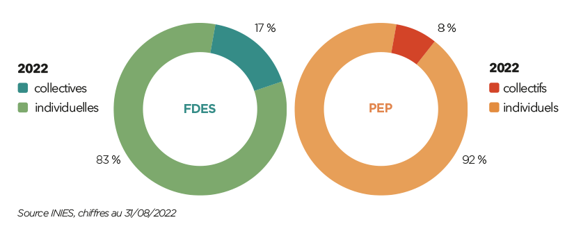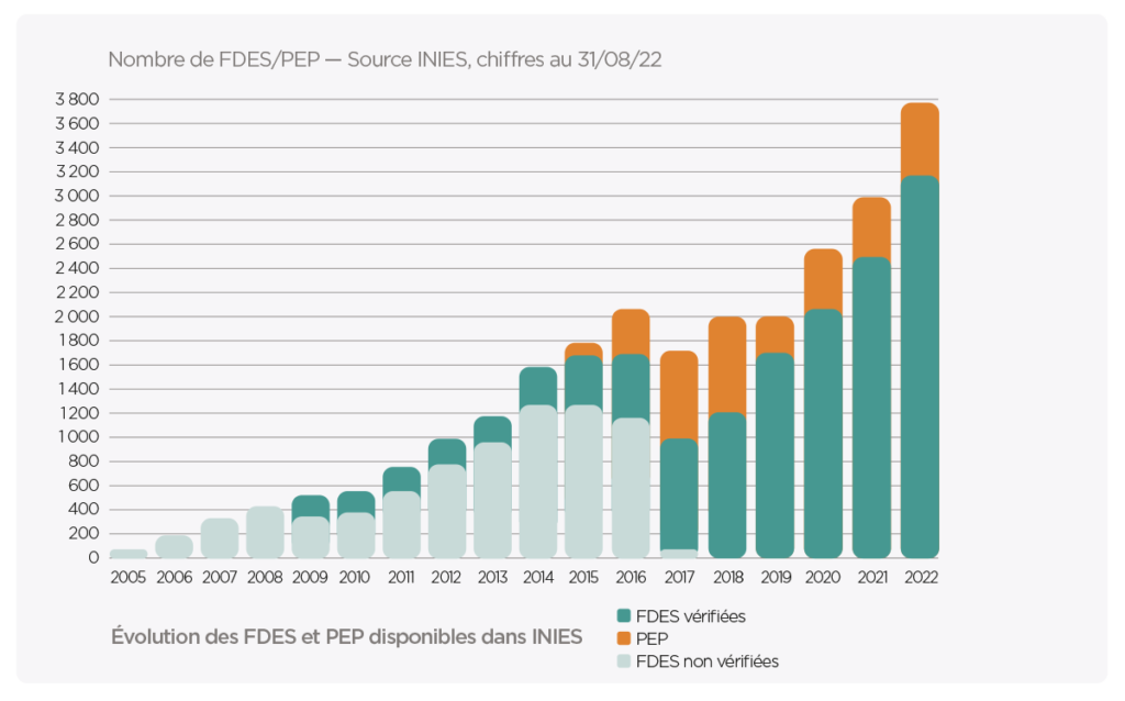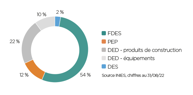 Au 31 août 2022, la base INIES compte 343 organismes déclarants de FDES et 51 organismes déclarants de PEP (dont 100 nouveaux déclarants de FDES et 5 pour les PEP depuis 2022). Cette très forte croissance du nombre de déclarants témoigne de la démocratisation de la réalisation des déclarations environnementales accompagnant la RE2020.