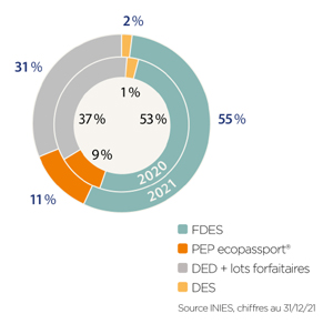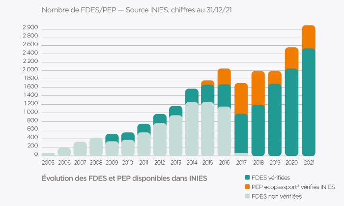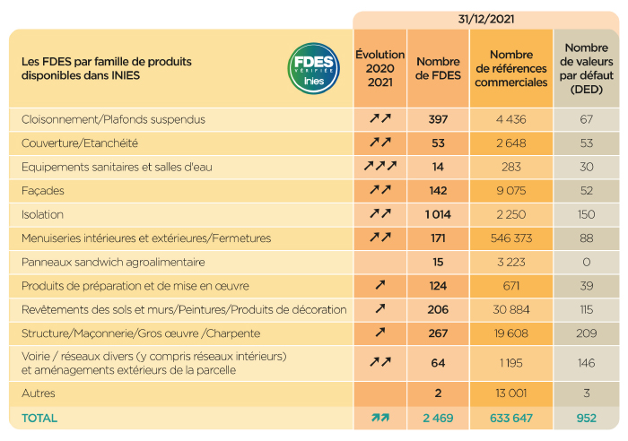 - Toutes données confondues (FDES, PEP, DED, DES), c’est 15% de données supplémentaires disponibles sur INIES entre 2020 et 2021.
