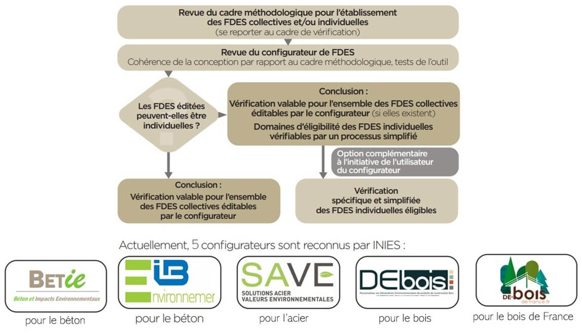 Depuis le 1er Juillet 2017, les fabricants doivent faire vérifier par une tierce partie indépendante (vérificateurs habilités) la conformité de leurs déclarations environnementales suivant les normes de référence dans le cadre d'un programme de vérification : programme INIES pour les produits de construction et programme PEP Ecopassport pour les équipements.Ces programmes ont pour cadre notamment l’arrêté du 31 août 2015 relatif à la vérification par tierce partie indépendante des déclarations environnementales qui fixe la méthode à respecter pour évaluer les impacts environnementaux des produits de construction, de décoration et des équipements du bâtiment dès lors qu’ils sont destinés à la vente au consommateur, ainsi que le contenu de la vérification, les compétences attendues du vérificateur et les conditions de reconnaissance d’aptitude de ce dernier. Chaque vérificateur passe un examen pour obtenir une habilitation. Elle repose sur les exigences de la norme ISO 14025 visant à qualifier les compétences requises pour assurer la qualité et l’indépendance des vérifications. Les prérequis à l’examen de vérificateur sont la pratique de l’analyse du cycle de vie dans le domaine des produits de construction ou des équipements et la réalisation à minima de 2 FDES / PEP ecopassport® pour des familles de produits différents dans les deux années écoulées. Toutes les données enregistrées dans le Programme INIES et PEP ecopassport sont valides pour 5 ans. Les points examinés par le vérificateur sont multiples :