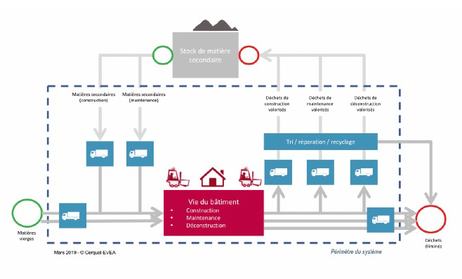 Certains indicateurs de l’économie circulaire ont été testés dans le cadre des travaux HQE Performance en utilisant l’analyse des flux de matière (MFA).