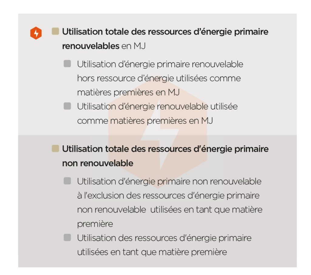 Sont distingués au sein des FDES et PEP, les indicateurs d’utilisation d’énergie renouvelable et non renouvelable.